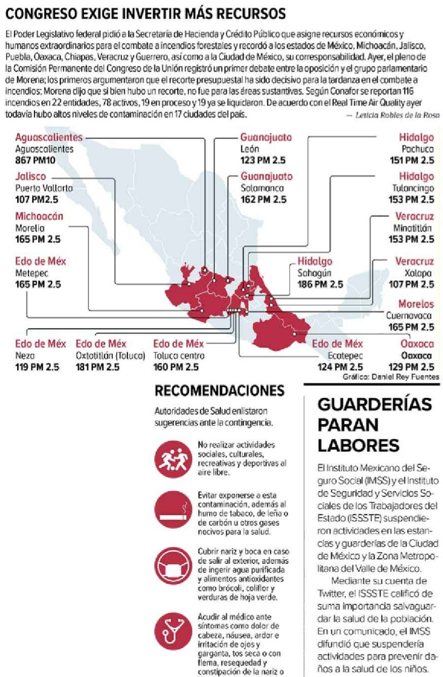Nuestro estado estuvo durante casi 4 días cubierto de calina, este es un fenómeno que está asociado con la ceniza de los incendios forestales, polvo, arena y arcilla que se suspende en el aire, esto pasó justo después de la impactante noticia sobre los niveles de contaminación en el aire en la ciudad de México, mientras que el estado de Oaxaca aún es un estado libre de material particulado a gran cantidad. Sin embargo desde el 14 de mayo hasta el día 17 del mismo se noto en una cantidad no tan alarmante de smog en el aire del la ciudad de Oaxaca de Juárez por lo que las autoridades comenzarán a tomar cartas en el asunto, desde la que se informó la situación de la ciudad de México las autoridades en colaboración con más ciudadanos y asociaciones civiles acordaron comenzar a plantar árboles a los alrededores de la ciudad y reforestando el cerro del fortín, así como a partir del día 1 de junio se reforestara el río Atoyac.